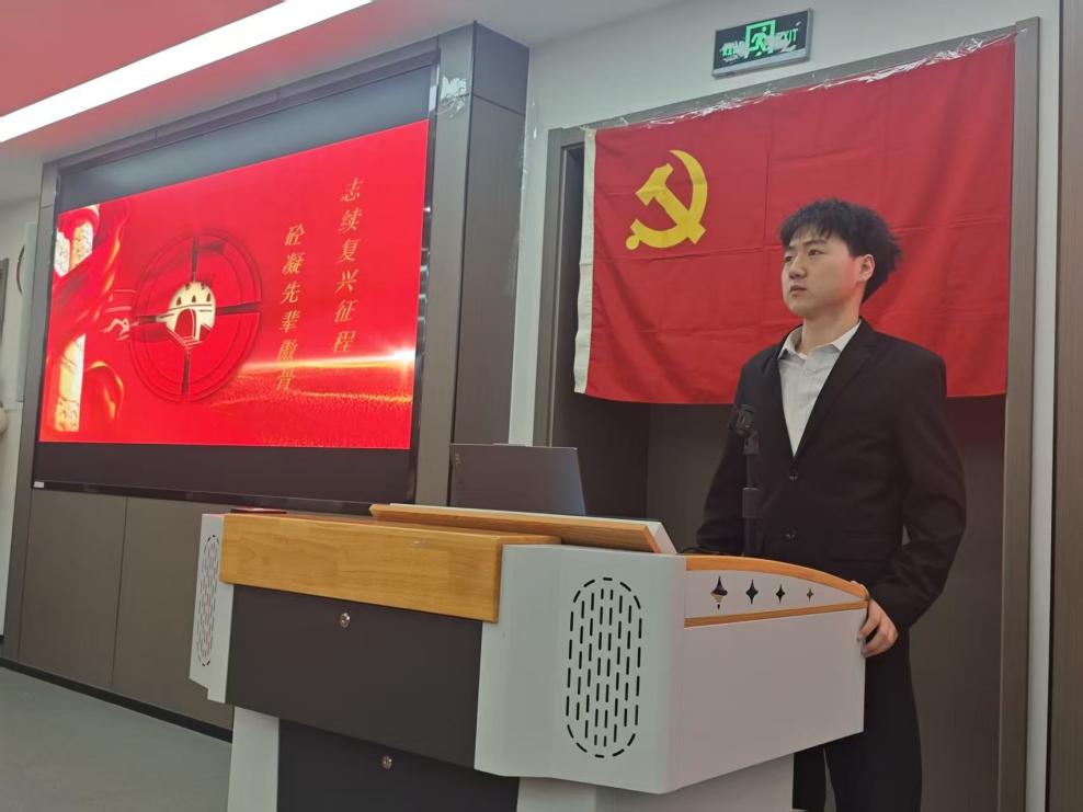 本科生第四党支部王福一唱以“抗战烽烟铸铁血,自立自强启新程”为主题,带领参会师生回顾抗战背景、历程与胜利意义,阐释抗战精神内涵,结合国家发展成就,号召新时代青年传承抗战精神、担当强国使命。