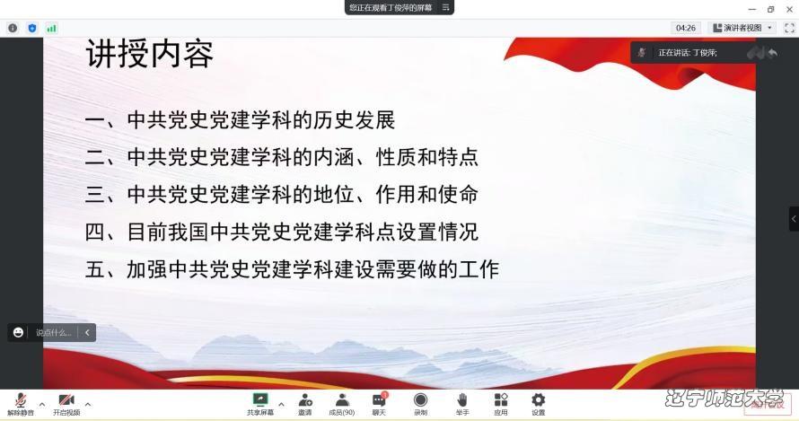 丁俊萍教授从五个方面详细阐述了中共党史党建学科的内容,分别是:中共党史党建学科的历史发展、中共党史党建学科的内涵性质及特点、中共党史党建学科的地位作用及使命、目前中共党史党建学科点设置情况、加强中共党史党建学科建设需要做的工作。