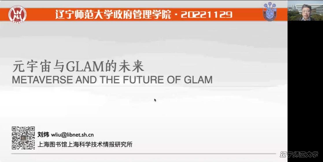 2022年11月29日19时,政府欧盘 有幸邀请上海图书馆上海科学技术情报研究所副馆(所)长、上海大学博士生导师刘炜教授开展题为《元宇宙与GLAM的未来》的线上讲座。本次讲座由政府欧盘 科研院长张丽艳教授主持,政府欧盘 师生、公共文化机构等从业人员等160余人参加。