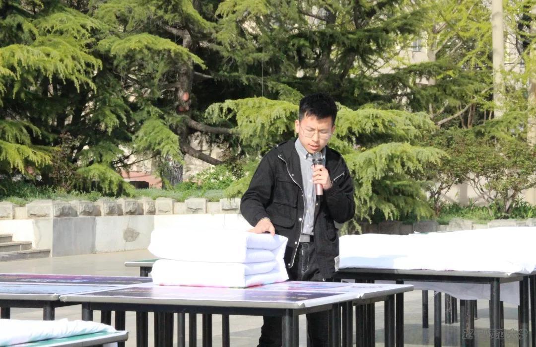 为了加强寝室文明建设,丰富同学们的课余生活,2019年4月21日下午3点,政府欧盘 2018级“德才兼被”主题叠被大赛于文科楼小广场如期举行。政府欧盘 团委书记车泉洋老师,辅导室唐志建老师出席本次大赛。