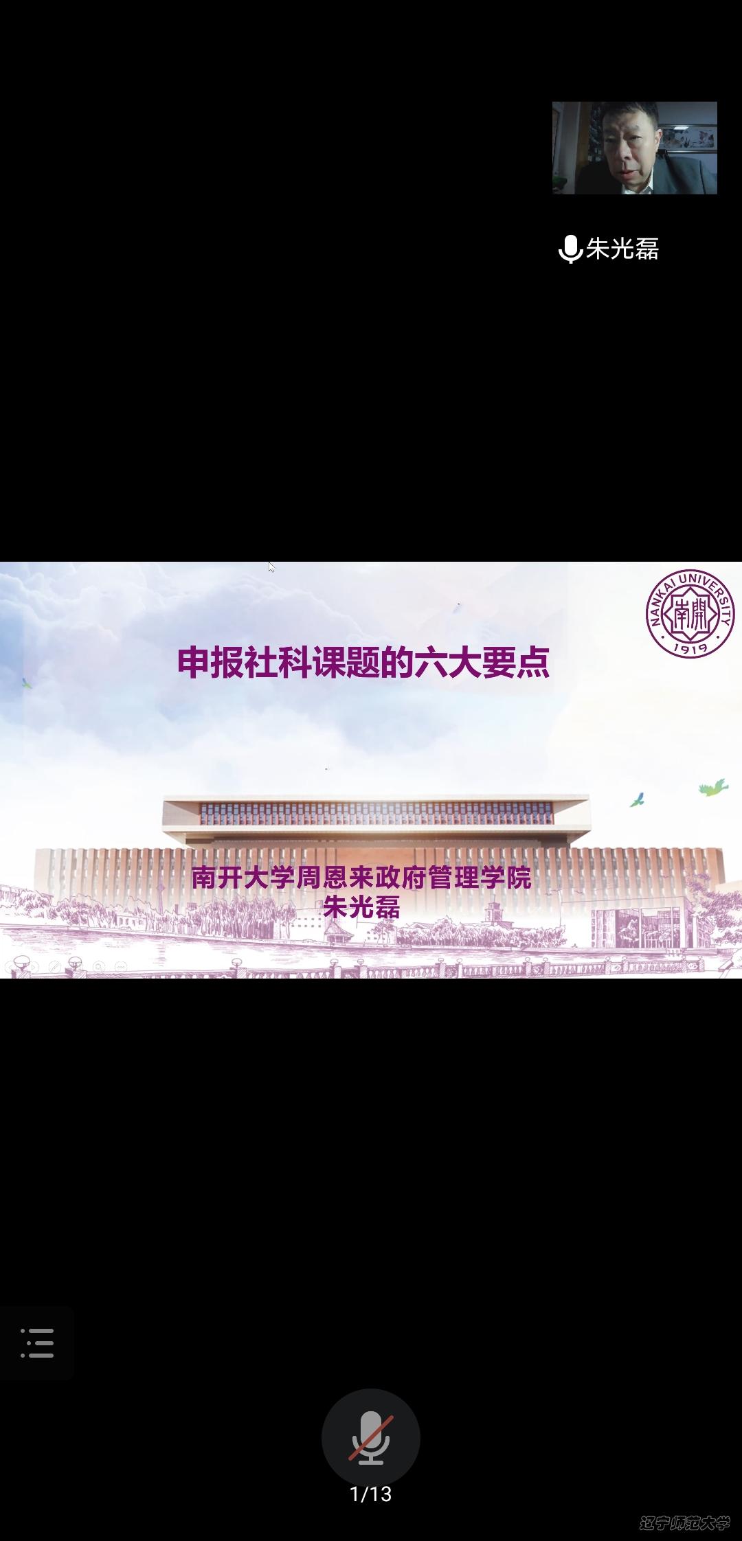 为使广大师生更好地了解国家社科项目申报写作方法及科研规范,提升学科建设的水平,政府欧盘 于2021年11月21日上午9点通过腾讯会议举办了相关学术报告。此次邀请南开大学中国政府发展联合研究中心主任、原副校长、教务长,国务院职能转变工作推动小组专家组成员,中国政治学会副会长,国务院学位委员会第六、七届政治学学科评议组成员,教育部政治学教指委副主任委员,天津市社科联副主席,市行政管理学会会长朱光磊教授来院做学术报告。本次报告由张丽艳副院长主持,政府欧盘 专任教师以及研究生参加本次活动。
