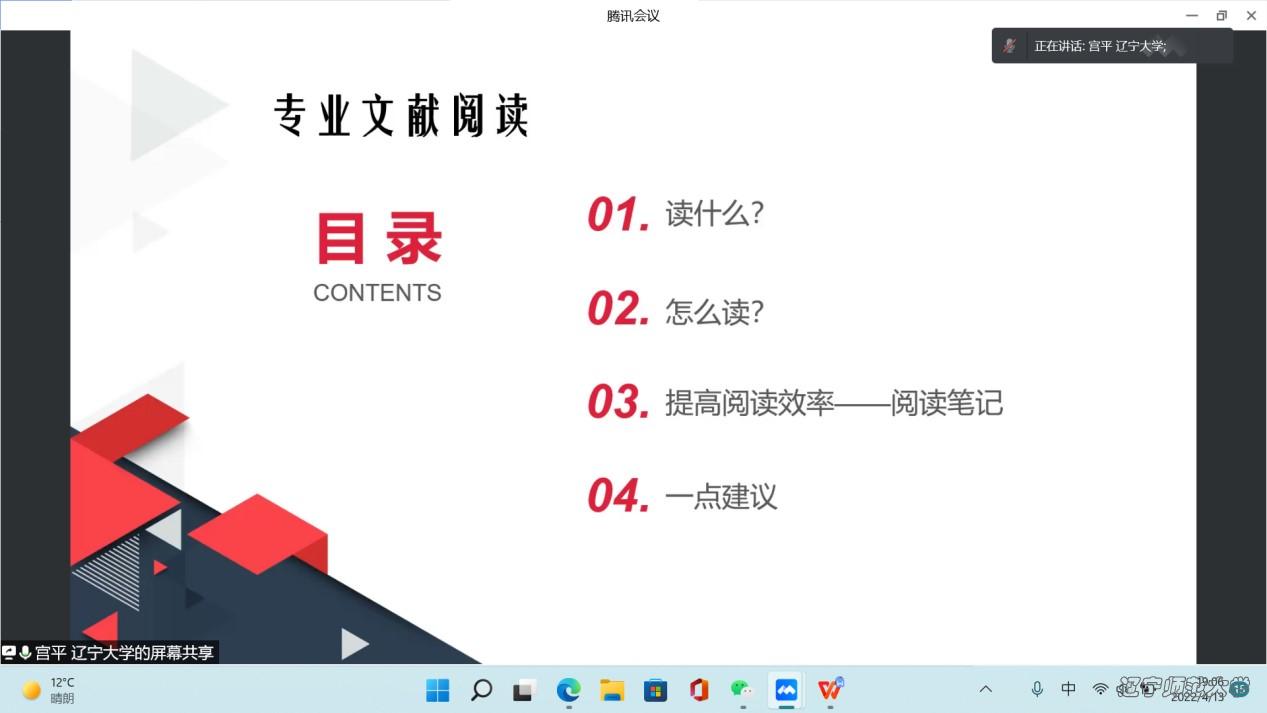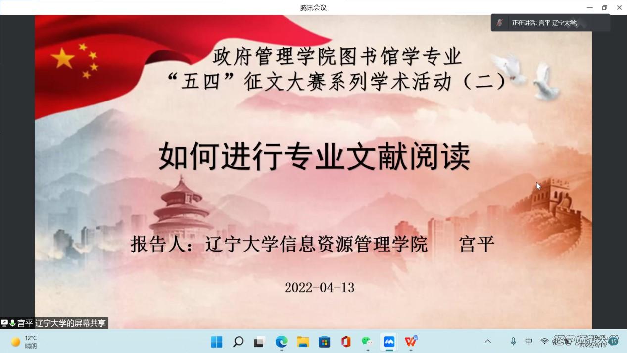 2022年4月13日19时,欧盘 政府欧盘 线上面向全院师生开展“如何进行专业文献阅读”的学术讲座,这也是图书馆学专业第六届 “五四”征文大赛第二期专题讲座。本次学术讲座由政府欧盘 张丽艳副院长主持,由辽宁大学信息资源欧盘 图书情报系主任宫平老师担任主讲人,政府欧盘 赵维良副院长、图书馆学专业的全体教师以及本科生与研究生参与本次讲座。